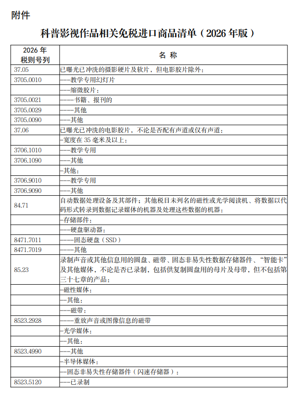 三、第一条第一项中的科普影视作品相关免税进口商品清单见附件,第二项中的科普用品免税进口商品清单由科技部会同有关部门另行制定印发。